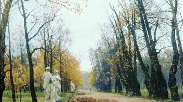 Особое внимание привлекают стволы деревьев. На правой стороне они кажутся особенно тёмными, почти чёрными, с мощной, графичной текстурой коры, словно выхваченные из полумрака. Их ветви уже значительно поредели, сквозь них просвечивает бледное небо, а на некоторых ещё цепляются последние, пожухлые листья. Это создаёт ощущение уязвимости и перемен, присущее именно этому времени года. Скульптуры на левой стороне, выполненные в светлых тонах, выступают из фона, добавляя классической строгости и напоминания об истории этого места. Их фигуры кажутся несколько размытыми, нечёткими, что лишь усиливает атмосферу мечты и воспоминаний.